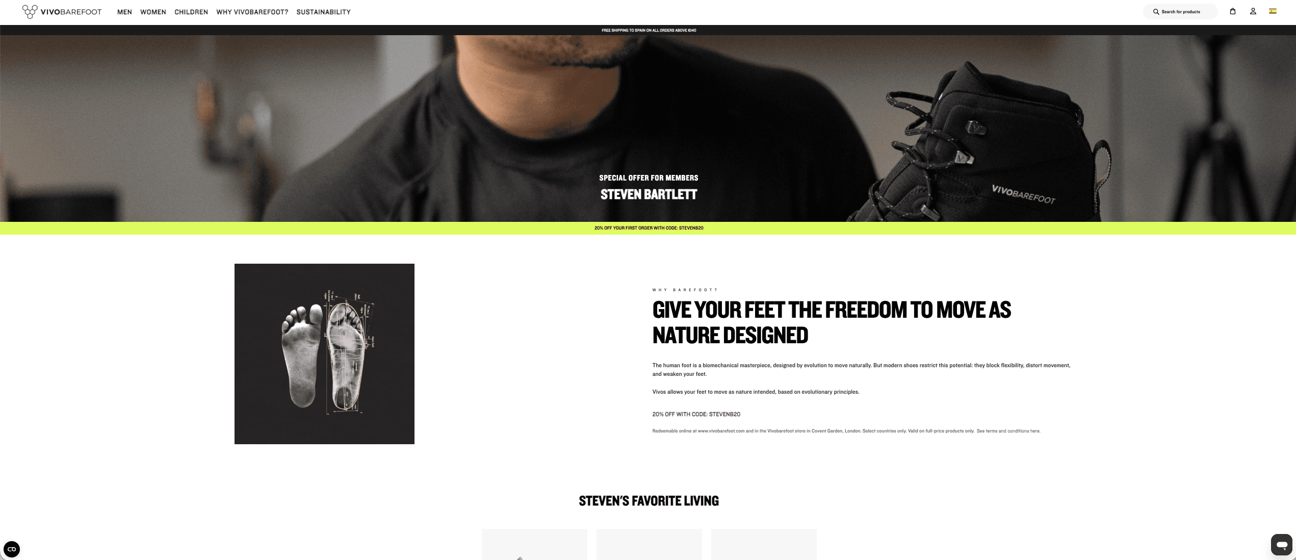 •“20% off at vivobarefoot.com/steven” is fast, clear, and creator-led