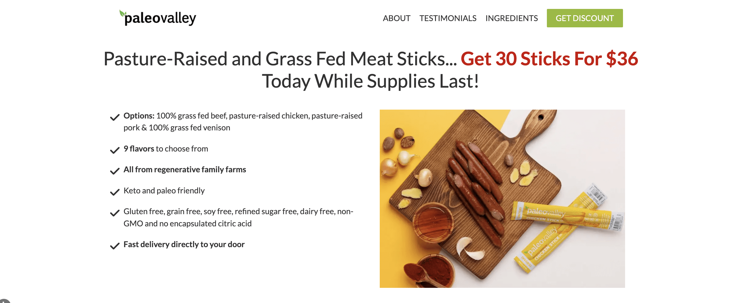 The ad opens immediately with a "big heads up" and promo: 30 meat sticks for $36 — translating to $1.20/stick. This sets the tone with high perceived value and cost-per-unit framing.