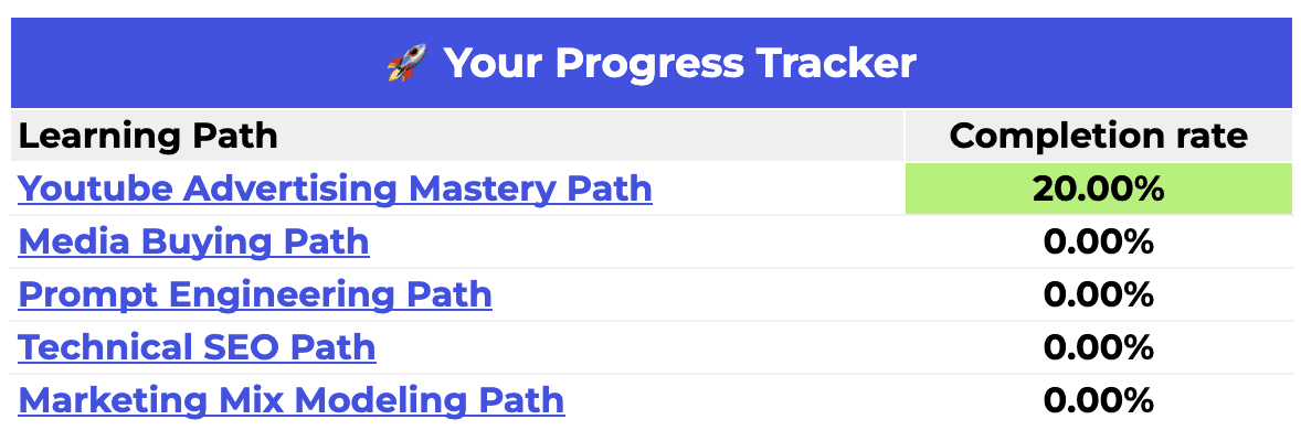 This path is designed to equip you with the skills and knowledge necessary to excel in YouTube advertising. It’s meticulously crafted to cover all aspects of YouTube marketing, from setting up efficient tracking systems to mastering creative strategies and performance campaigns.