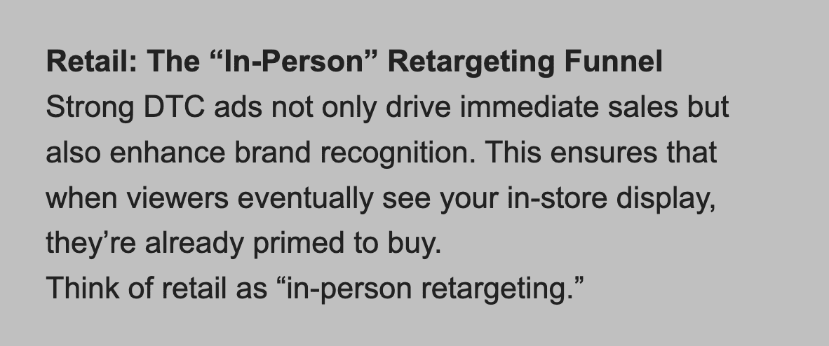 This DTC-to-retail pathway has been paved by countless brands, because at a certain scale of DTC / Direct Response, it just makes sense: