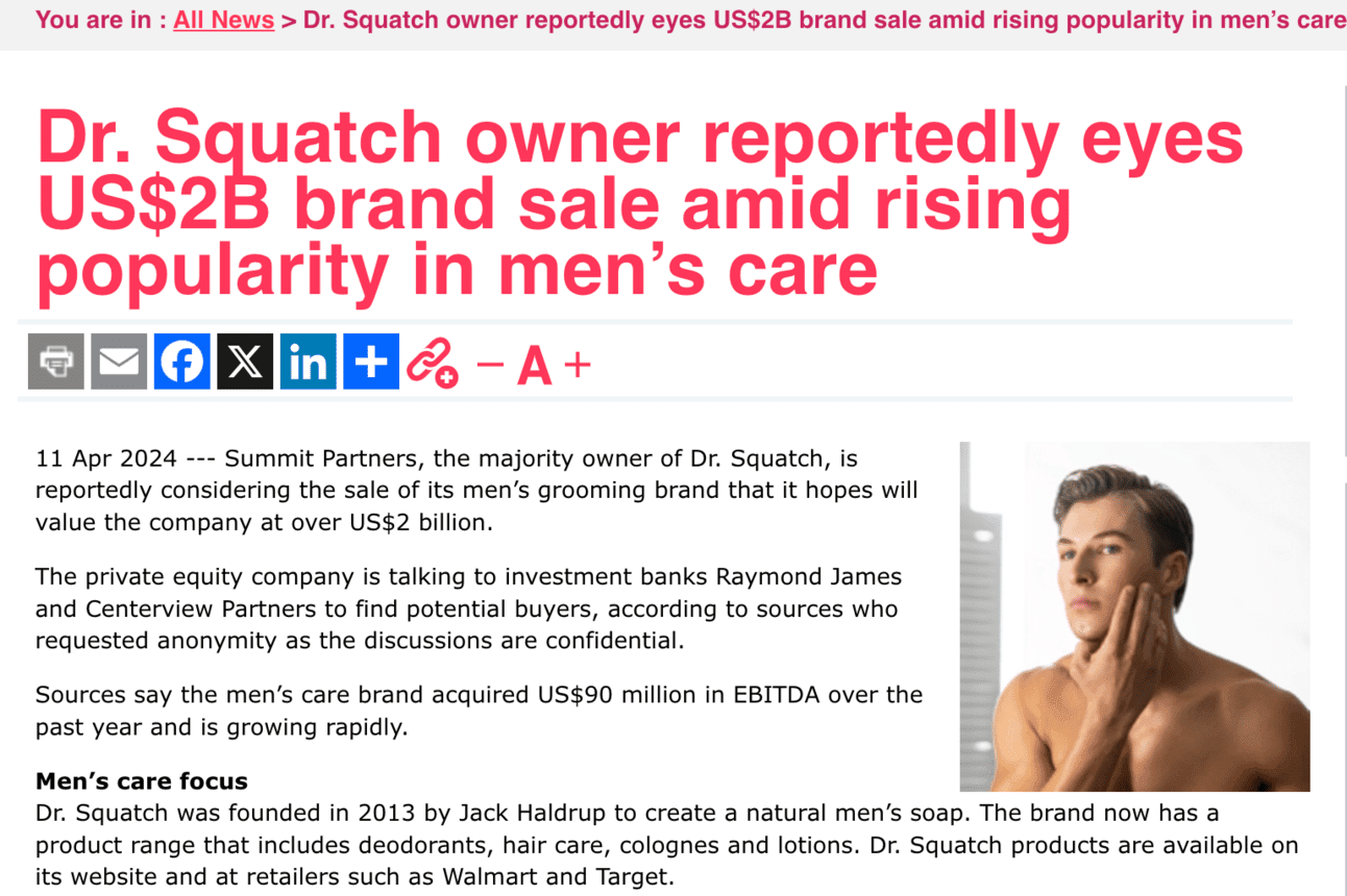 Our favorite Direct Response Soap Brand Dr Squatch is in talks to sell to private equity for $2 Billion Dollars: