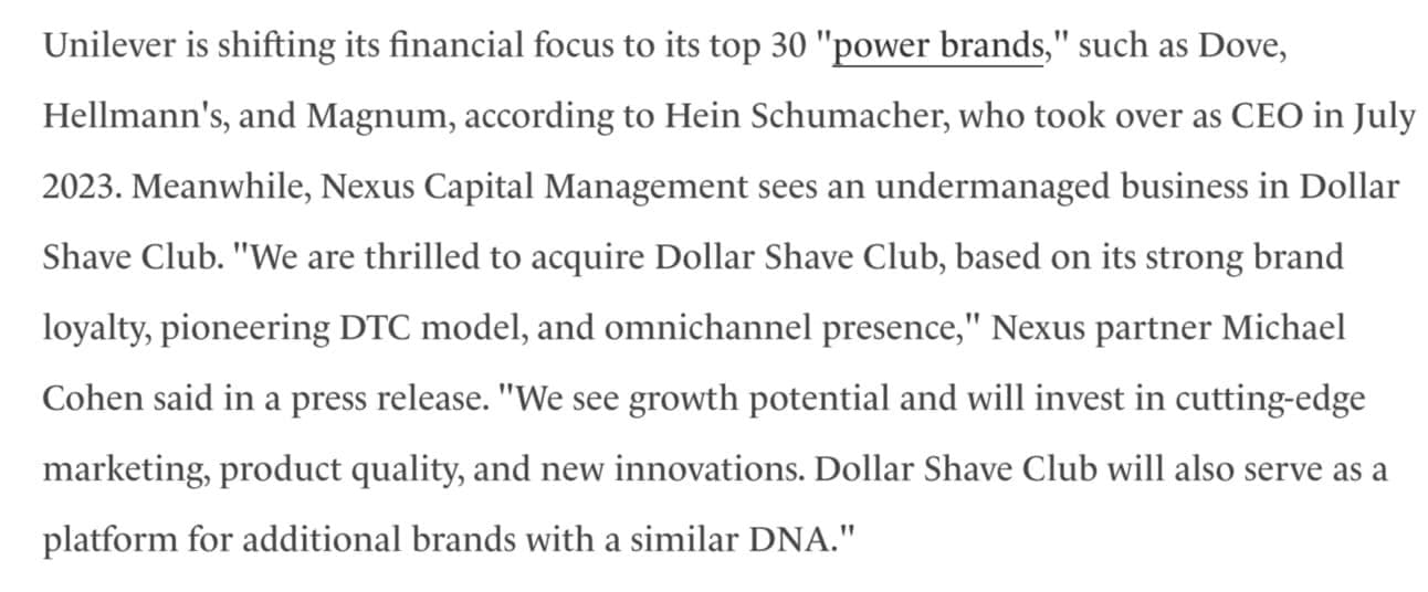 (Speculation has it that Unilever saw fit to off-load some peripheral brands after an overall revenue drop in 2023 (see below))