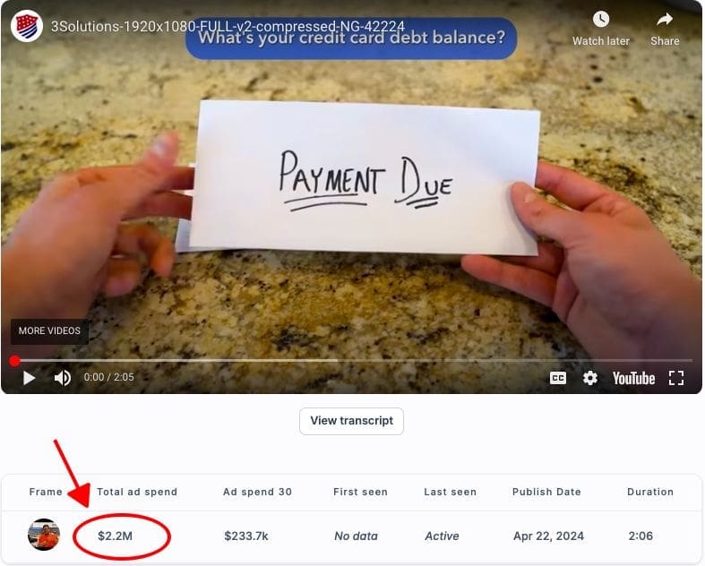 This one actually uses 7 different types of priming. The cumulative effect: This ad creates a psychological journey that mirrors the debt relief process itself, and it has 2.2M USD in ad spend. It uses visual and emotional triggers to move viewers from paralysis to action through carefully orchestrated priming sequences. Let's dive deeper into its psychological cascade: