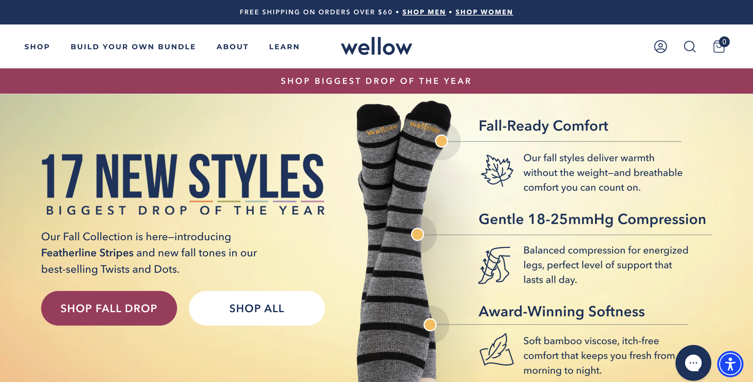 Through a wispery testimonial and close-up textures, Wellow sells compression socks as the everyday luxury your legs didn’t know they needed!