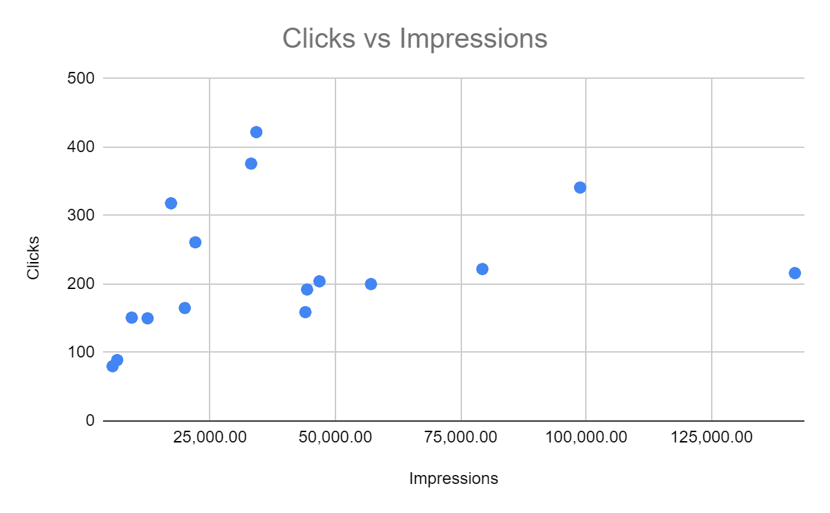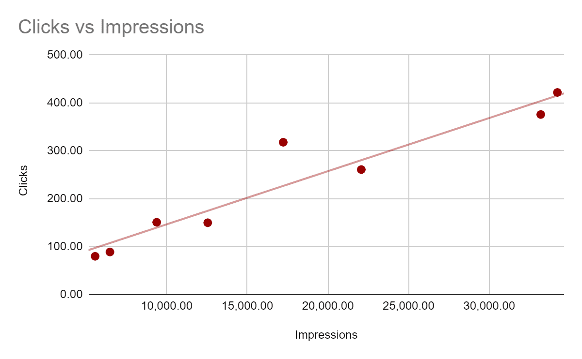 The main conclusion is that dots that represent pairs (impressions, clicks) almost lie on the trendline with a slope which is some kind of average CTR for eight days (not really average, but explaining that is totally another story). Dots above the line are the ones with the highest CTR, and dots below the line are the ones with a lower CTR than the ‘average’ value.