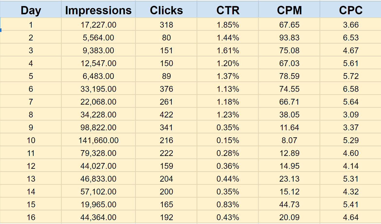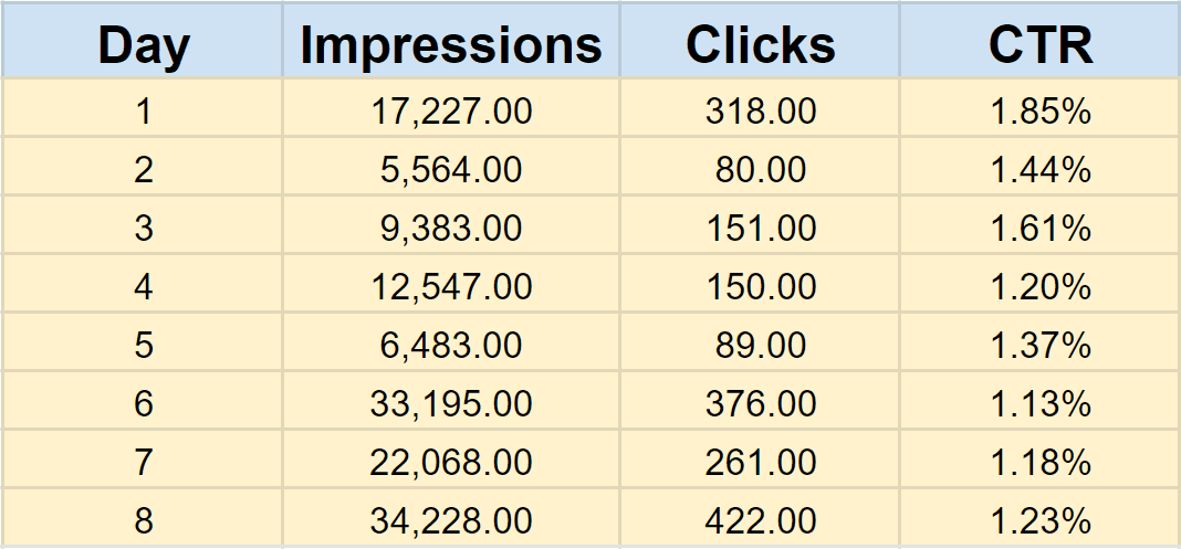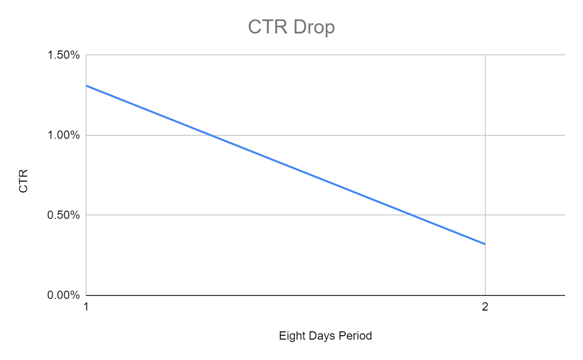 Thus, there is no reason to think that your campaign is underperforming in clicks when you see an extreme CTR drop. On the contrary, maybe you’ve got more clicks for the same money than when your CTR has high values since it’s not impossible to have a lower CPC with a CTR drop at the same time. Let us use, for example, data for Day 5 (CTR is 1.37%) and Day 9 (CTR is 0.35%). On Day 5, you needed 1/0.0137=73 impressions to get one click, and on Day 9 you needed 286 impressions to get one click. But, if your Cost for both days was around $1,000 per day, you would achieve 1,000/5.72=175 clicks on Day 5 compared to 1,000/3.37=297 clicks on Day 9.