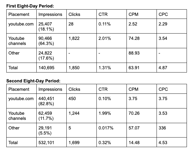 Let me begin! For those who don’t know about this yet, ‘youtube.com’ represents filtered ‘display’ performance, or better said, in-feed impressions of your ad. Youtube channels are our in-stream impressions, while we don’t know anything about ‘Other’. Anyway, those are the placements of our ad without any success (mostly). As you can see, ‘Other’ has a catastrophically bad performance, with almost no (or literally NONE) views or clicks, and google doesn’t provide the data to us, so don’t fantasize that you can exclude ‘Other’ in the future. But don’t forget, you pay for ‘Other’, the same as you must pay for the other two segments. And, as I said, we don’t know what ‘Other’ really is.