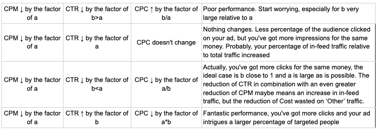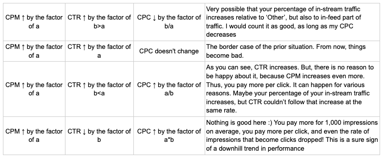 Anyway, let us summarize: CTR means nothing without other metrics, if it is your main performance indicator, don’t forget to check the others among them. If you are using smart bidding, google is searching for the best solutions due to your bid, CTR is just an incidental metric that you have insight into. It CAN, but not necessarily, be a good performance indicator, but at the end of the day, you’ll pay for impressions. Hence, go to CAMPAIGNS → CONTENT → WHERE ADS SHOWED, and see what you have to pay. Also, compare your daily CPM, CTR, and CPC combinations to quickly get an impression of your performance, here is a tabular review of possible CTR/CPM/CPC relations (a and b are some random real numbers):