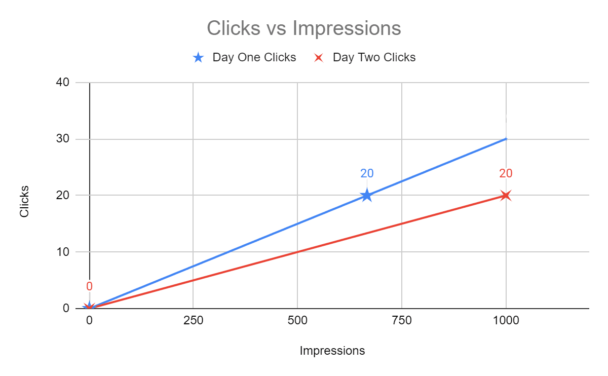 Mathematically speaking, ideal and constant CTR would be a slope k of the linear function y=kx, where x is the number of impressions, and y is the number of clicks. In the English language, it would be the rate of the increase in the number of clicks with respect to the number of impressions, if the clicks increase linearly with impressions.