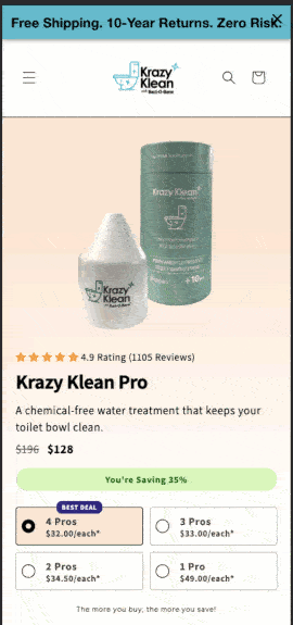 Visuals of Instant results: "Just drop one into the water and boom" with visuals underscores simplicity and convenience. "Safe patented solution that will last for up to 10 years," highlights its long-term value and safety.