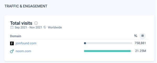 Opening up our comparison panel in SimilarWeb, we see that in the past 3 months, Noom has over 28x more traffic than Found: