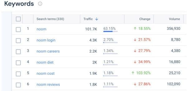 - And #2 & #3 paid & organic search are nearly 50% branded terms. Which means these are searches where people are typing in terms directly related to “noom”, like the following SimilarWeb screenshot shows: