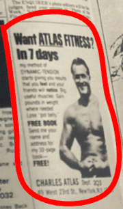 “FREE BOOK” fitness info product funnel from bodybuilder Charles Atlas, promising results in just 7 days