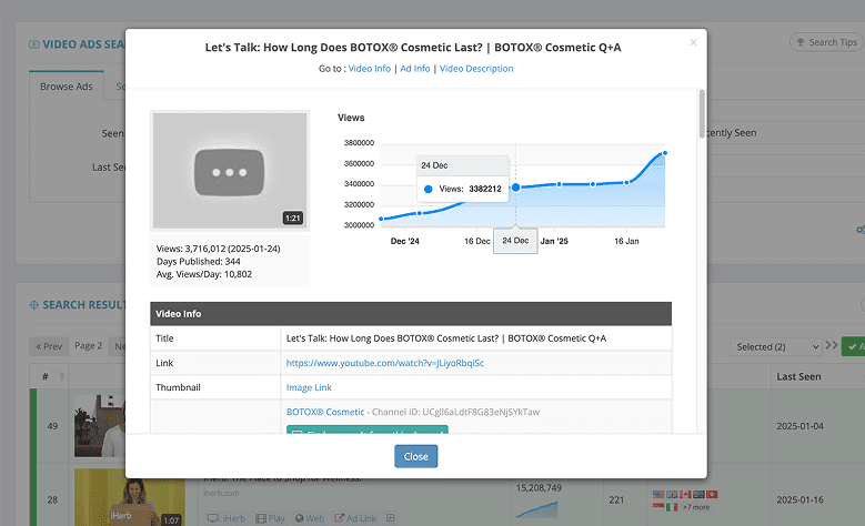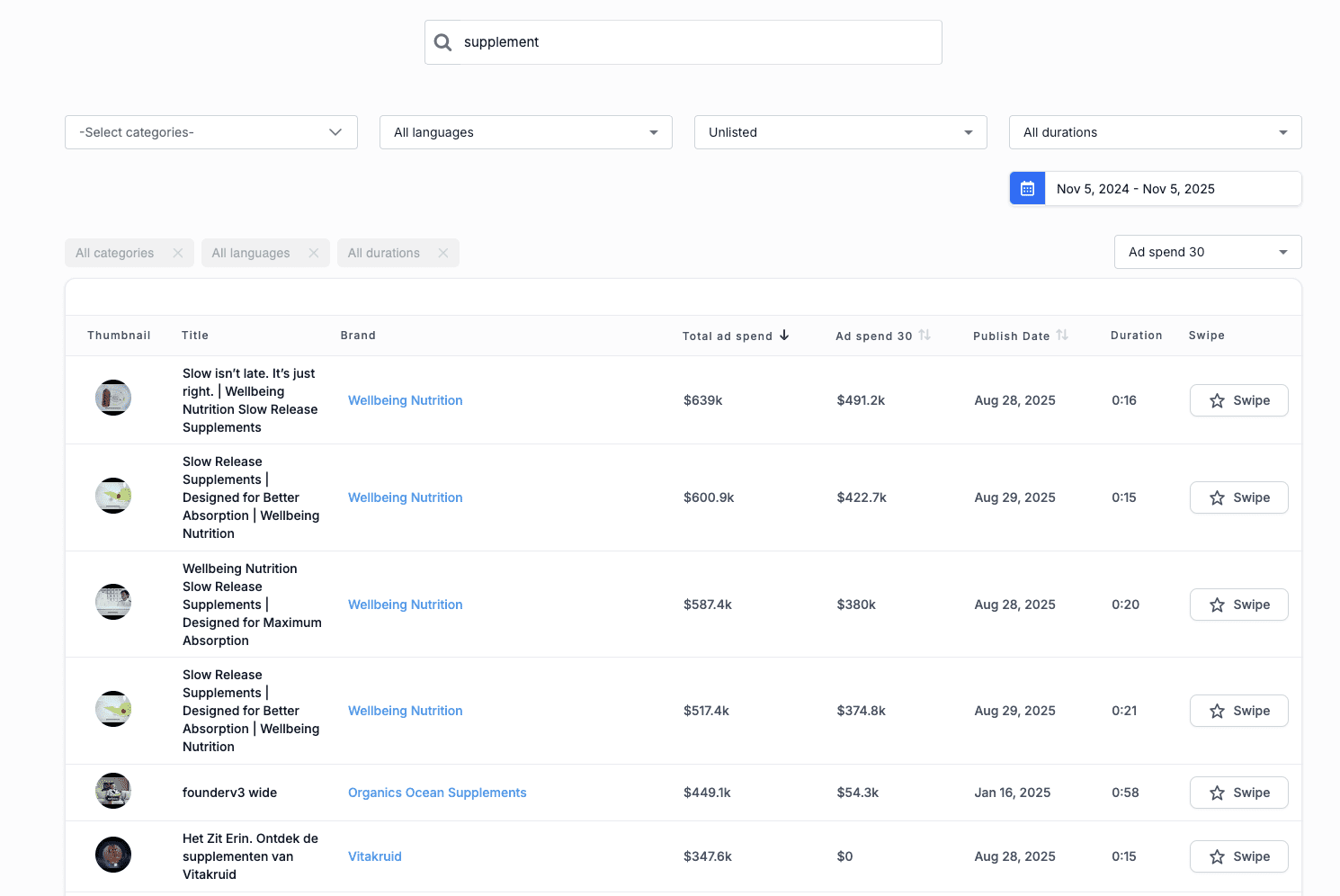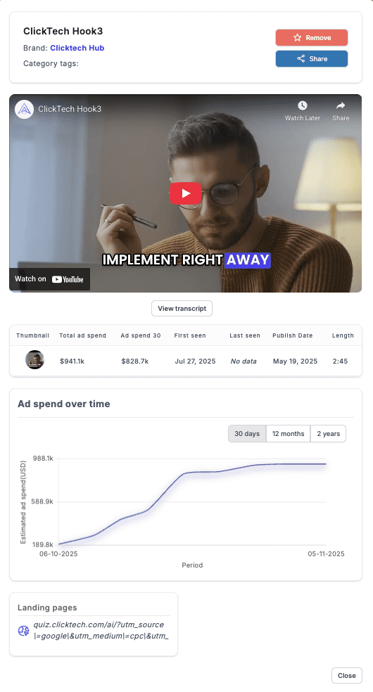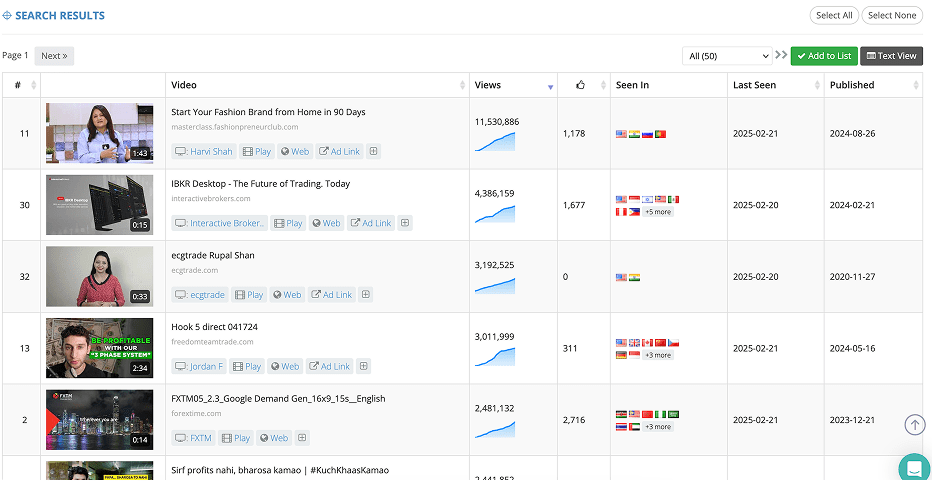 It’s purpose-built for YouTube ad clarity, tracking 29M+ public and unlisted video ads, with ad spend estimates, brand-level analytics, and fast, intuitive filtering.