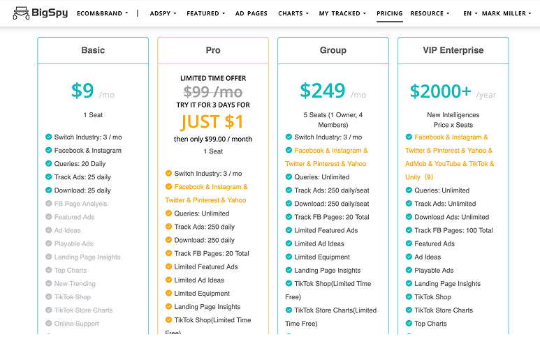 BigSpy’s VIP Enterprise plan (the only option with YouTube access) comes at a $3,000+/year upfront cost, which makes it a big commitment for marketers who prefer to test tools before locking in: