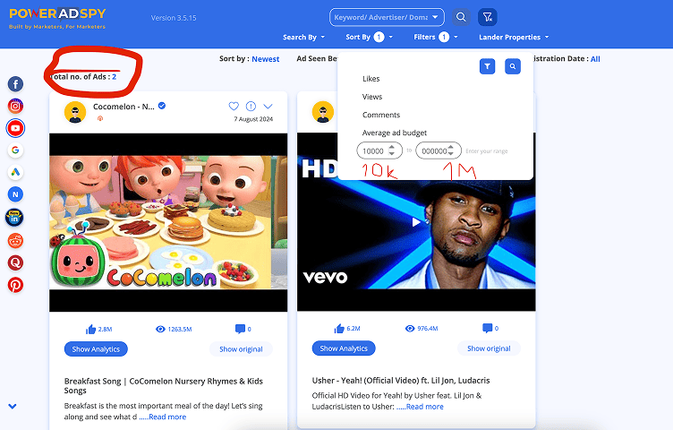 PowerAdSpy’s strength is its Facebook data, not YouTube insights. The YouTube section contains limited, outdated data and lacks real ad-spend or performance tracking.