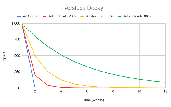 A(t)=Spend(t)+adstock_rate A(t-1)