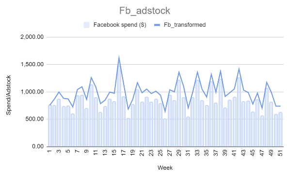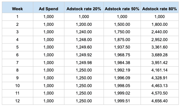 - In the third week, we also spent $1,000, but now we have 0.8 $1,800=$1,440 from the prior week, hence, our transformed spend is $1,000+$1,440=$2,440