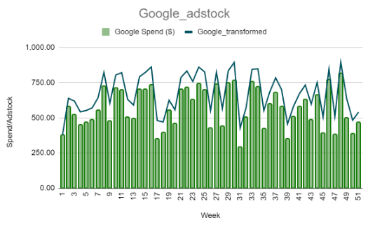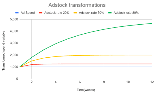 It is not hard to conclude that the adstock rate transforms our spend series into a new series of higher values. The higher the adstock rate, the higher the new series values are.