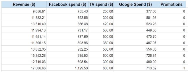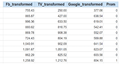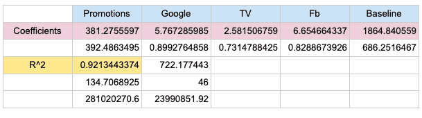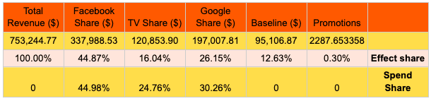 We transformed our spend variables to include their impact on the following week's revenue. The next step can be multiple linear regression again, but now, we use transformed spends instead of row values. The result is given in the following table:
