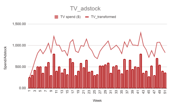 - In the second week, we spent $1,000 but we have 0.8 $1000=$800 of impact from the prior week, hence, our transformed variable is $1,000+$800=$1,800
