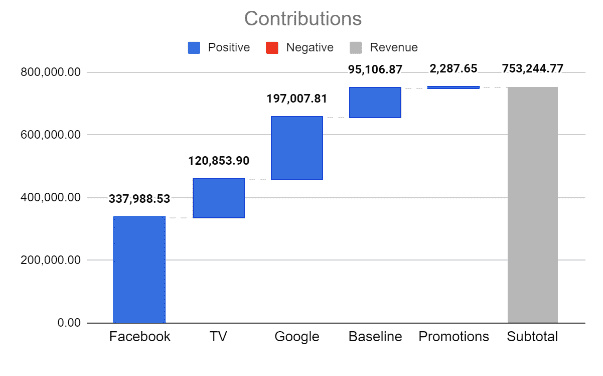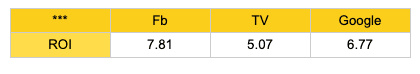 Each of the spend variables increases its effect share in comparison to the prior model, TV even doubled its impact on the revenue (16%), since it has the highest adstock rate! Facebook generated nearly 45% of the total revenue, and Google videos generated 26%. ROI of each spend channel is given by: