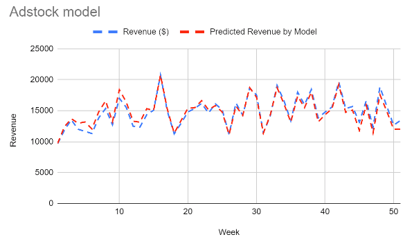 Most of our revenue is driven by marketing activities, adstock helped us to estimate the contribution of each channel better! And at the end, we have an actual/predicted chart, where we can see that the new model better explains dips and spikes in our revenue, with a MAPE of only about 4%!